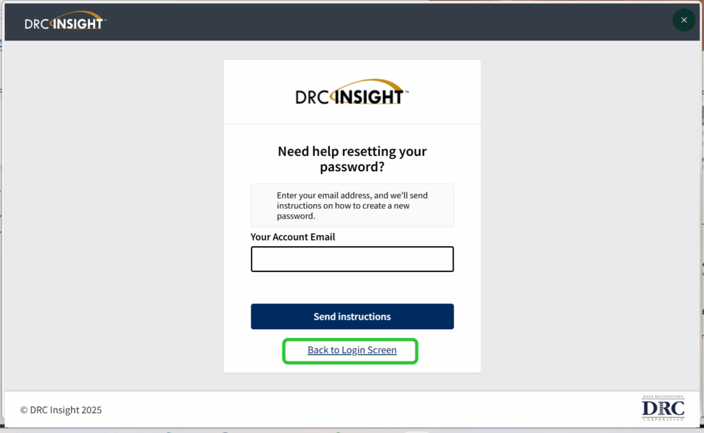When the DRC INSIGHT page loads, sign in with your DRC INSIGHT credentials. Your username is the email address which received these instructions from DRC HR. Use the following options to proceed with your password: