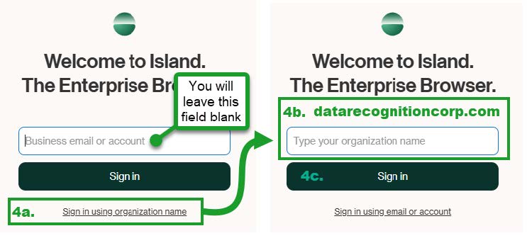 2. Access Island using the organization name option (see below image) and entering datarecognitioncorp.com: